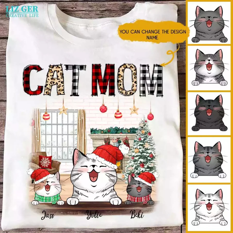 Personalized Christmas T-Shirt for Cat Moms – Featuring Your Name & Furry Friends