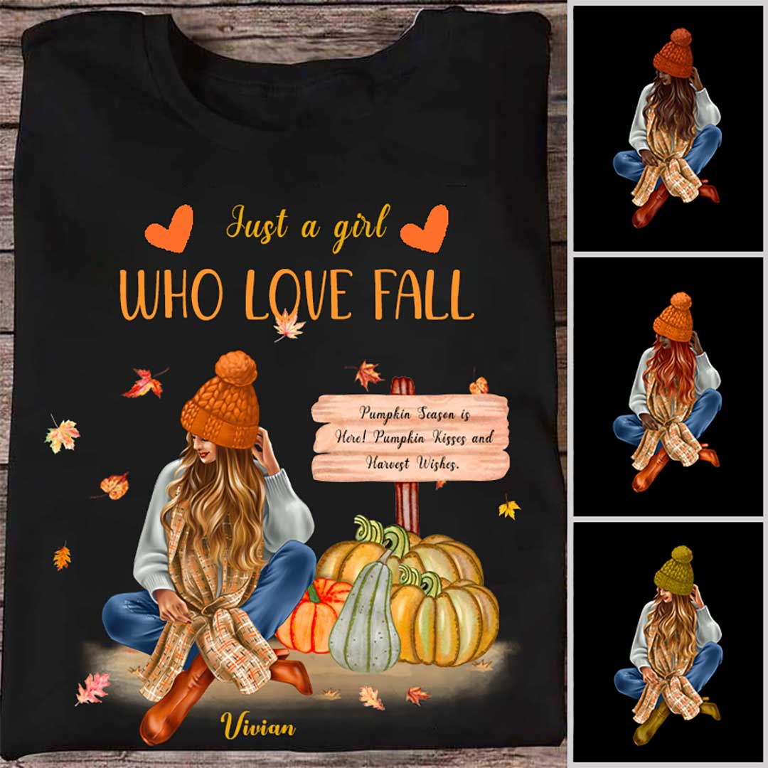 Just a Girl Who Loves Fall. Personalized Pumpkin T-Shirt for the Queen of Cozy Season.