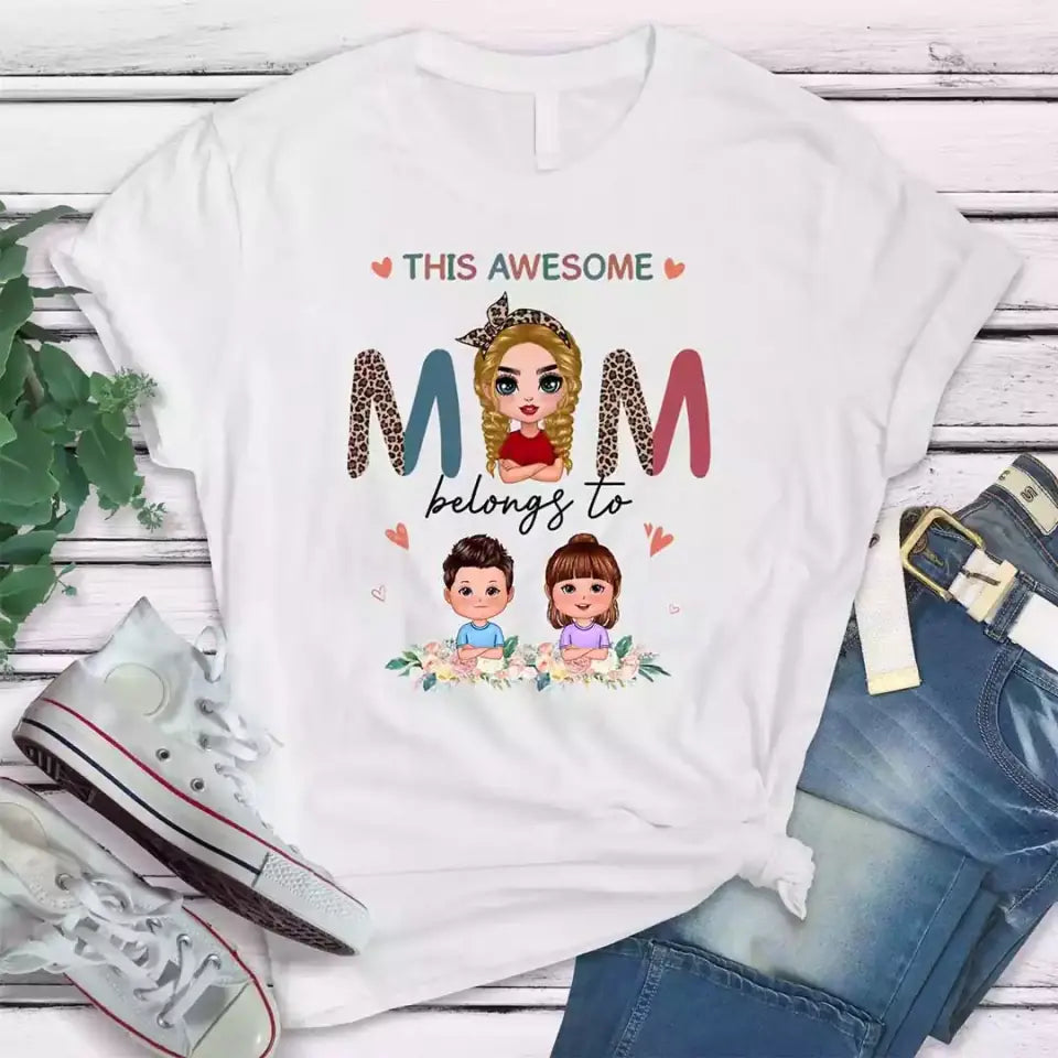 Adorable “Awesome Mom Belongs To” design full of heart.