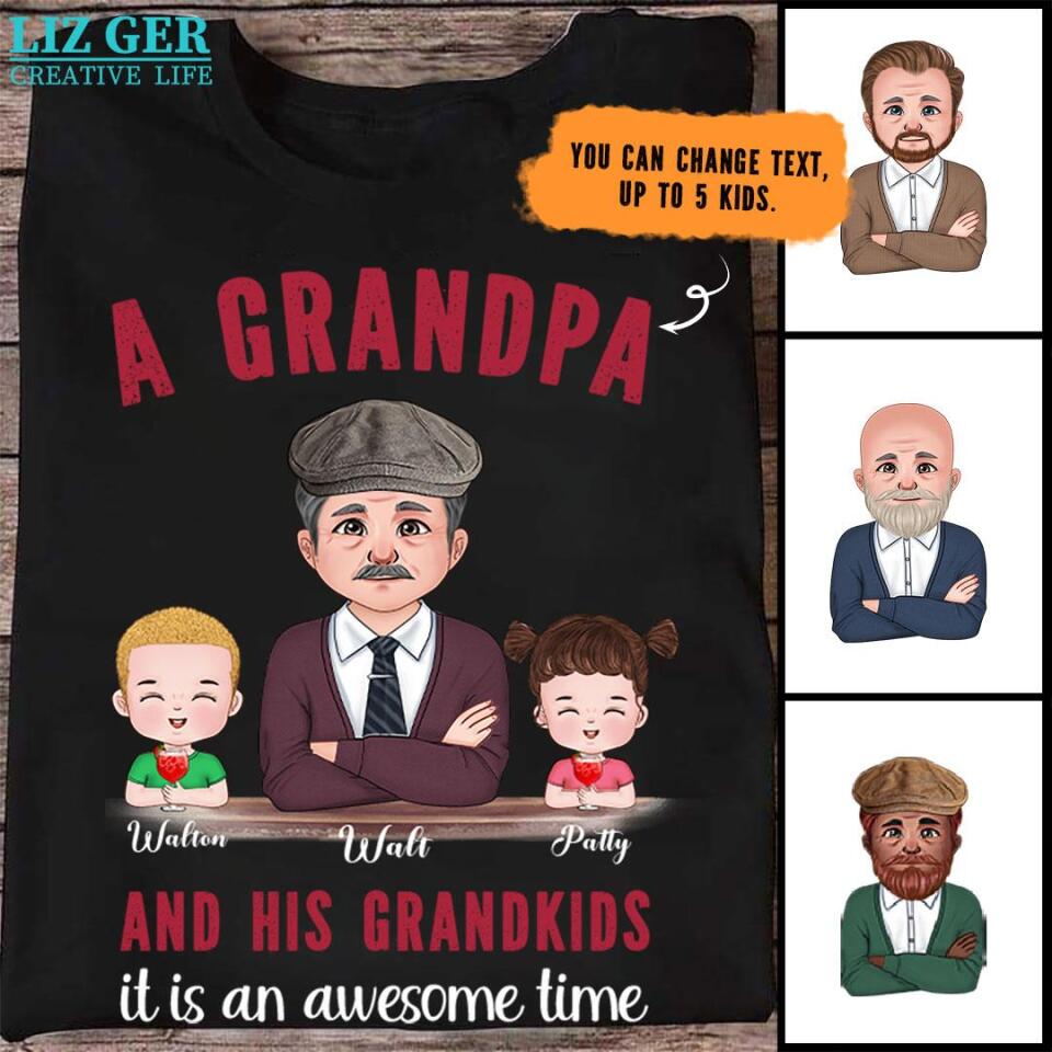 Our “A Grandpa and His Grandkids – It’s an Awesome Time” Personalized T-Shirt is a heartfelt tribute to that special connection, made even more meaningful with the custom names of his favorite little sidekicks.